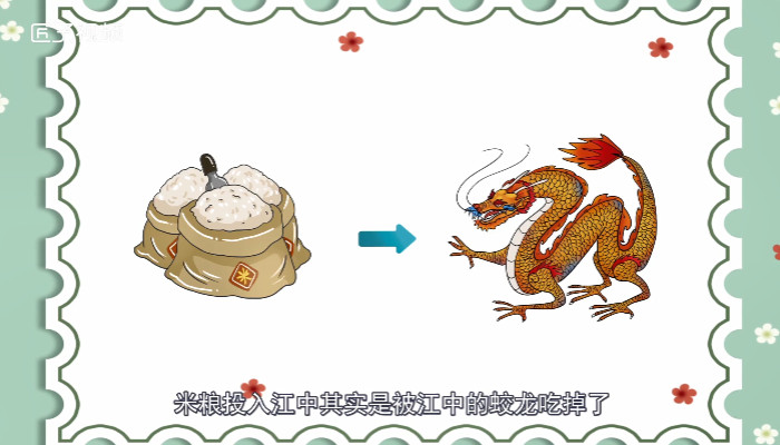 传说屈原死后,楚国百姓哀痛异常,纷纷涌到汨罗江边去凭吊屈原。百姓为了避免鱼虾咬食屈原的身体,就纷纷将米粮投入江中,希望鱼虾只顾吃这些米粮,而不去损伤屈原的身体。后来,屈原托梦百姓说,米粮投入江中其实是被江中的蛟龙吃掉了,如果将其用艾叶包裹,再绑以五色绳,则可以免遭蛟龙吞食。这才有了后来的粽子。