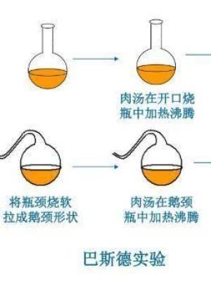 巴斯德将肉汤放在两个烧瓶中,第一个烧瓶是普通的敞口烧瓶,细菌可以通过空气直接与烧瓶内肉汤接触,结果没多久,这个烧瓶内的肉汤就腐败了。