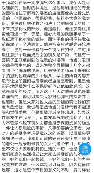 节目中张硕伦要洗澡钟丽缇没有遮盖好摄像头惹得丈夫十分不满。钟丽缇担心观众误会第一时间在微博澄清事实。最后表示说要学会换位思考理解丈夫,她做这个节目就是要让观众朋友了解到她生活中的好与不好,了解她真实的生活状态。好的一起共勉,不好的努力改变。因为他们之间有爱,有爱就足够了。爱可以改变一切,这也是节目本身的意义。
