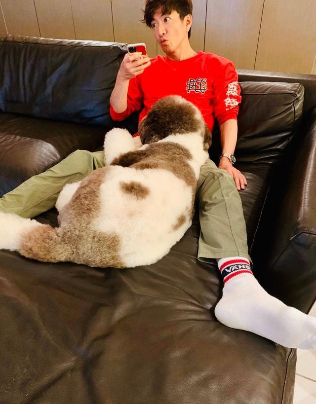 平时木村拓哉在家里和宠物狗一起躺在沙发上