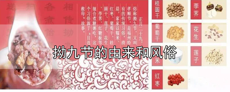 相传目连的母亲平素蛮横,死后灵魂被罚没有饭吃,目连送的饭都被鬼卒吃掉,直到了难看的“拗九粥”,母亲才吃到饭。拗九节风俗是用糯米、红糖、花生、红枣、芝麻、桂圆等原料煮成甜粥,用来祭祖或馈赠亲友。