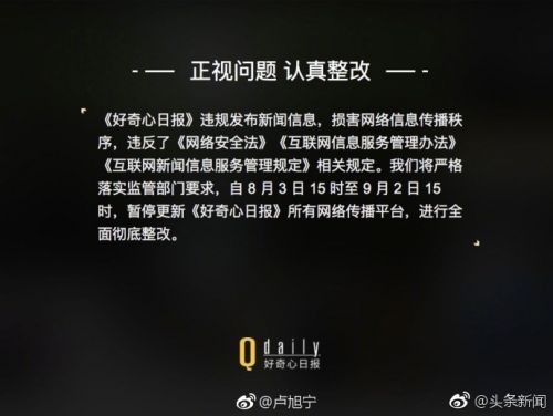【好奇心日报所有平台 暂停更新一个月】《好奇心日报》违规发布新闻信息,损害网络信息传播秩序,违反了《网络安全法》《互联网信息服务管理办法》《互联网新闻信息服务管理规定》相关规定。将严格落实监管部门要求,自 8 月 3 日 15 时至 9 月 2 日 15 时,暂停更新《好奇心日报》所有网络传播平台,进行全面彻底整改。