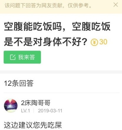还有网友以某宝客服的语气回答,亲,这边建议您先吃一碗汤面再吃米饭可能会好一点,俗称吃饱了撑的。(大概,这也是吃饱了没事干)还有网友假装很认真的说,空腹不能吃饭,因为以前吃死过。