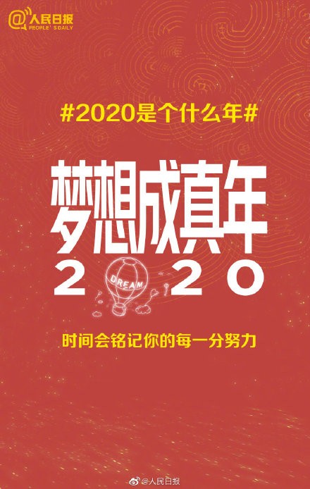 【2020是个什么年?每个人都该知道的2020大事件】①全面小康年:全面建成小康社会的收官之年;②奥运年:中国代表团全力冲刺东京奥运会;③“北斗”年:北斗三号系统将全面建成;④“火星”年:我国将择机发射火星探测器;⑤5G普及年:预计年底实现全国所有地级市5G网络覆盖。 @人民日报:【转存!2020是个什么年?】2020终于来了!2020年是个什么年?是闰年,2月29日出生的同学又能过生日了;奥运年,中国代表团将全力冲刺东京奥运会;火星探测年,中国探火强势来袭;全面小康年,全面建成小康社会的收官之年…2020更可以是梦想成真年,每一个努力的你,都能用奋斗创造属于自己的奇迹!