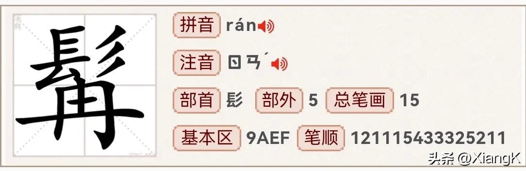 读音为“rán”,同音字“然”,部首为“髟”,总笔画15,上下结构。