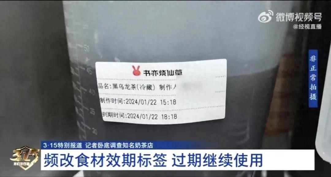 据了解,3月14日晚,湖北315晚会曝光了书亦烧仙草武汉广埠屯门店在操作时违反规定,存在频繁更改食材效期标签、使用隔夜食材,甚至用嘴尝食材来判断是否“坏了”的现象。(张天元 图源:视频截图)