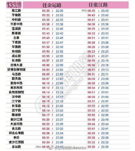 【地铁爱广播:13号线首末班车时间】13号线二、三期已开通试运营。13号线既有站点的首末班车时间均维持不变,13号线全线运营时间5:30~23:45,金运路站往张江路站首班车时间5:30,末班车时间22:30;张江路站往金运路站首班车时间5:30,末班车时间22:30。
