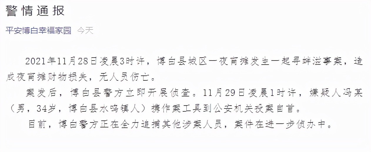 “平安博白幸福家园”微信公众号11月29日通报,2021年11月28日凌晨3时许,博白县城区一夜宵摊发生一起寻衅滋事案,造成夜宵摊财物损失,无人员伤亡。