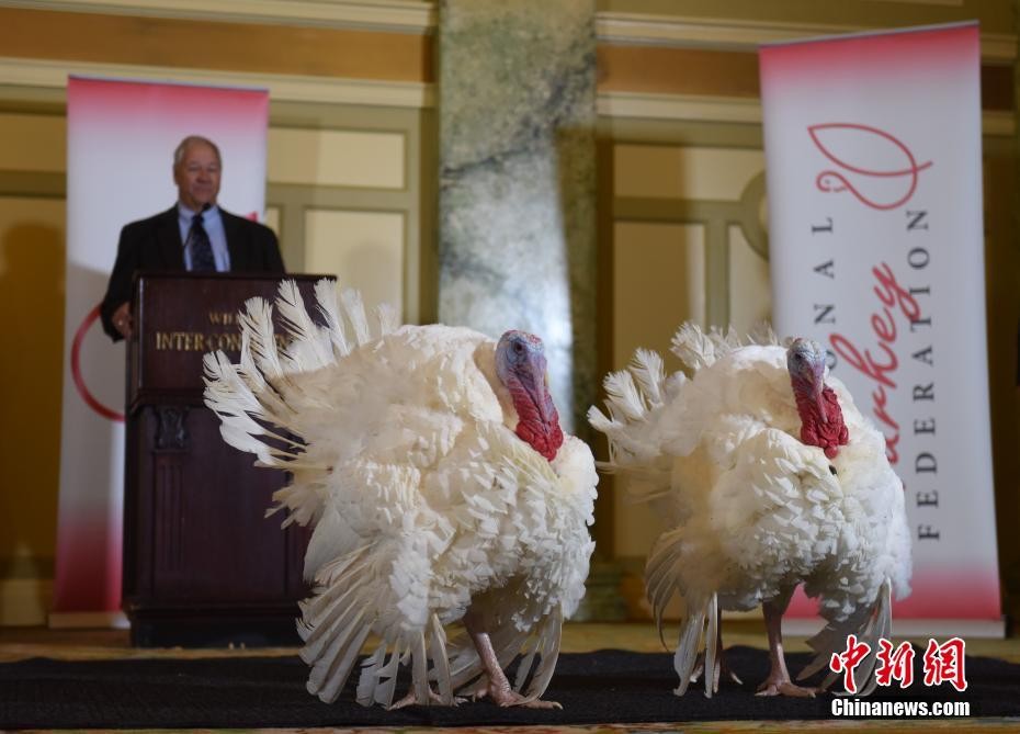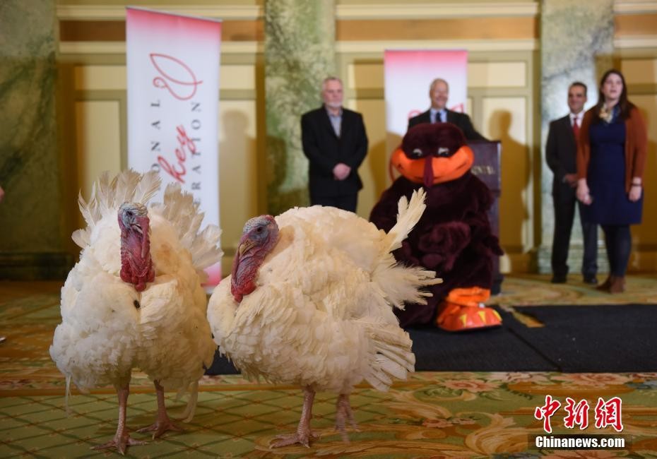 当地时间11月19日,两只将被美国总统特朗普赦免的2018年“感恩节幸运火鸡”亮相华盛顿。这两只分别名为“豌豆仔”(Peas)和“萝卜丝”(Carrots)的雄性火鸡,由全美火鸡协会(The National Turkey Federation,NTF)赠送给白宫。年度总统赦免火鸡仪式将于当地时间11月20日在白宫玫瑰花园举行。中新社记者 陈孟统 摄