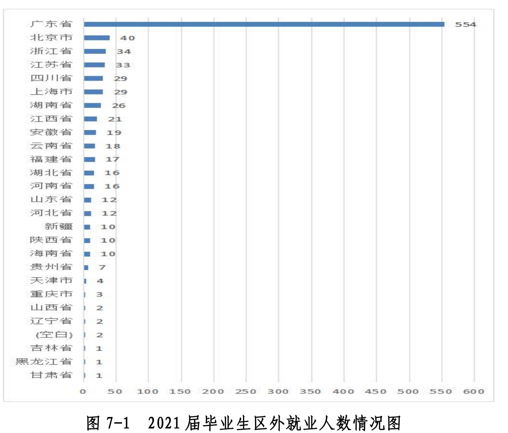 从走向就业岗位的毕业生来看,广西财经学院2021届毕业生就业地域以广西区内为主,区内就业的本专科毕业生人数达 3239 人,约占就业总 人数的 78%,区外就业的本专科毕业生人数为 929 人,约占 就业总人数的 22%。到区外就业的毕业生,主要是到广东省进行就业,由于地缘关系的原因,这一点很好理解。