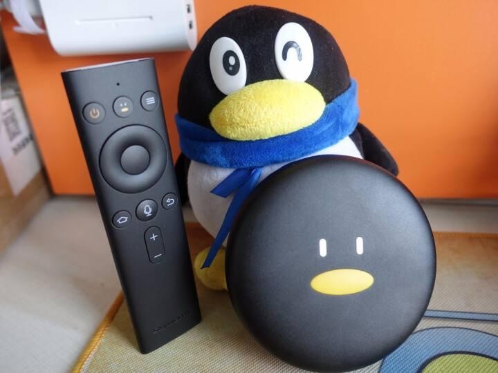 首先,腾讯是真的懂设计的,能把网络机顶盒设计得这么可爱的也只有它了。圆圆的企鹅脸,加上黑色的小眼睛及黄色扁扁的嘴巴,真的是非常可爱,在小黄嘴的下面还藏着一个LED灯,再加上这款网络机顶盒经过磨砂工艺的处理,因此上手更加舒适。
