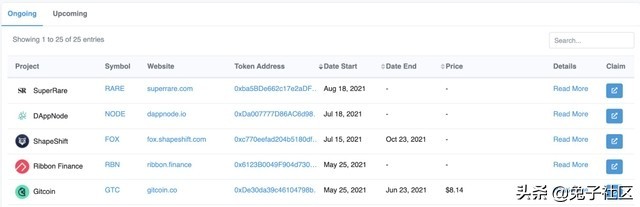 Etherscan还可用作以太坊网络持续空投的数据库。每个空投都有专门的参与规则,可在[详情]栏中查看。前往此链接查找空投列表: