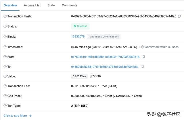 同时,还支付了0.001559212674537枚以太币的交易费用。交易完成后,钱包中将显示这个交易ID: