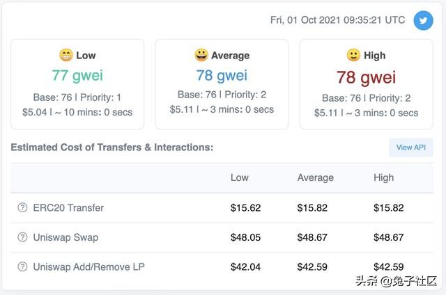 燃料费价格是以太坊交易费用的一部分。这些费用由交易所在的区块决定。每个区块都有各自的固定费用,根据网络流量而有所不同。Etherscan中的燃料费跟踪页面显示不同燃料费价格的金额和时间变化。这是一款非常实用的工具,可大致预测网络拥堵程度,以及简单转账或复杂智能合约交互需支付的费用。