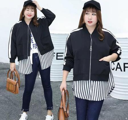 黑色拼接条纹的假两件上衣,下面搭配个紧身弹力牛仔裤,上身宽松,下身修身,整体看起来人很利索,显瘦哦!胖mm适合这样的穿搭哦!
