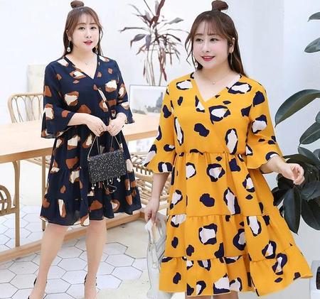 豹纹是今年很流行的印花,V领的设计很有女人味,收腰显瘦,裙摆是蛋糕裙的设计,遮肚子藏肉肉,胖人穿更好看哦!