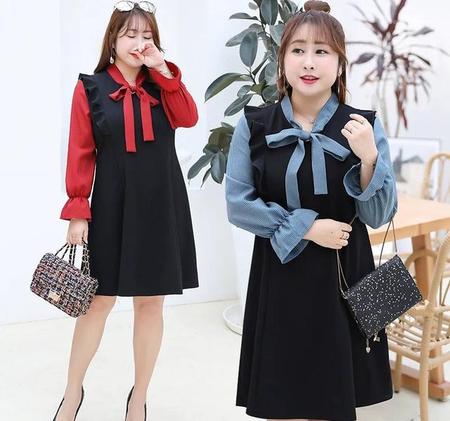 法式蝴蝶结假两件连衣裙,撞色设计,A字收腰下摆,木耳边小飞肩,领前蝴蝶结时尚个性,胖妹妹穿很显瘦哦!