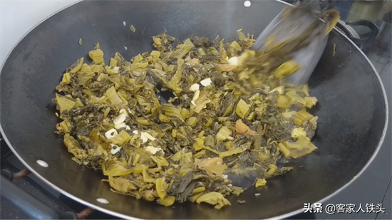 第三步:热锅下油,把姜蒜粒爆香,爆香后倒入酸菜,把酸菜翻炒一下